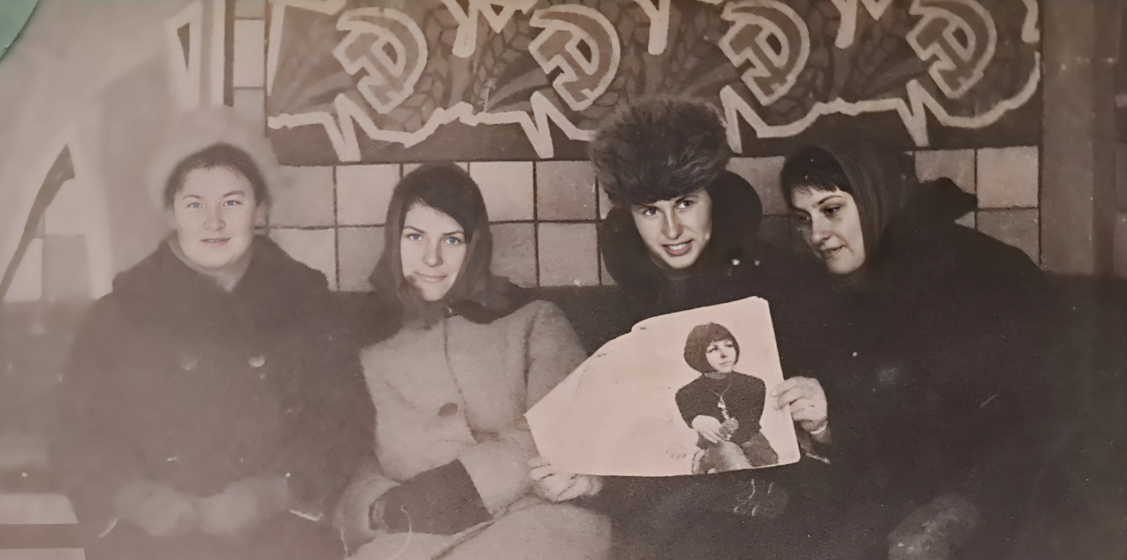 Жительки с. Варвы, Прилукского района, сидят в советской автобусной остановке с мозаикой.